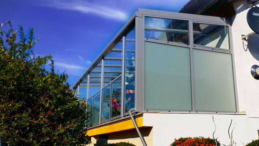 Wintergarten (Ganzglas)Wintergarten mit Dach u. Ganzglas- Schiebeanlage